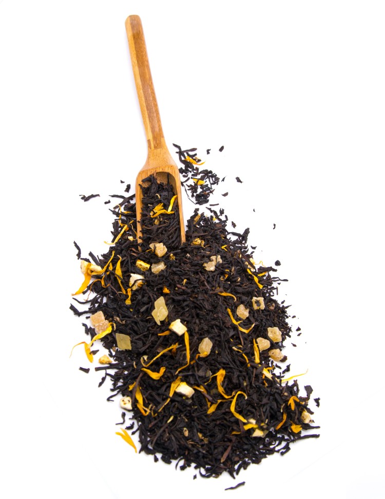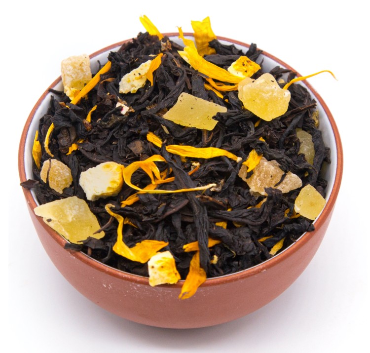 чай черный индийский, кусочки ананаса, кусочки лимона с цедрой, кусочки апельсина с цедрой, лепестки подсолнечника, аромат бисквита с лимоном.