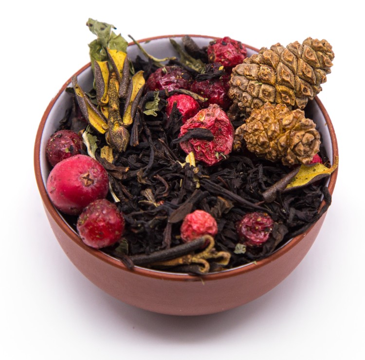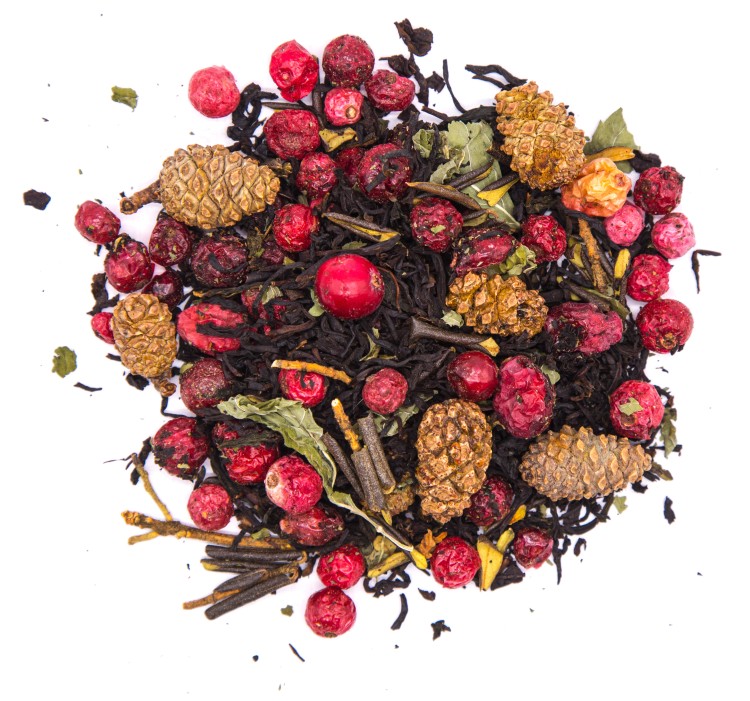 Чай черный индийский, иван-чай, шишки сосны, смородина красная ягода, клюква ягода, можжевельник плоды, мята, аромат хвойного леса