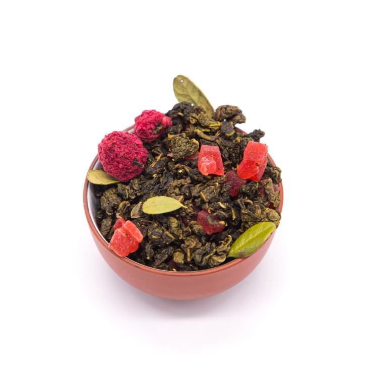Чай улун китайский, цукаты ананаса, ягоды малины, листья брусники, аромат малинового сорбета